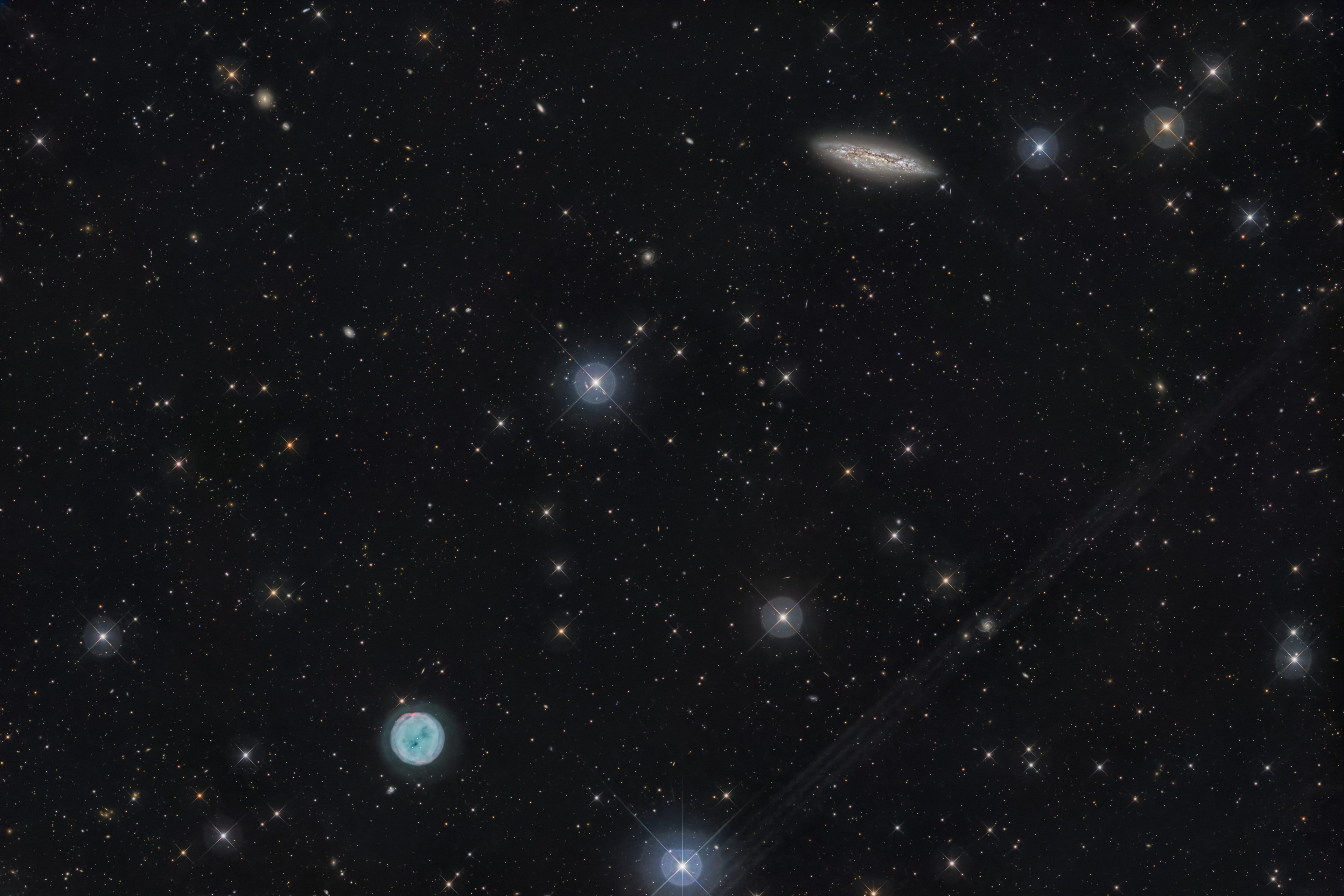 14 years after my first photo, I finally managed once again to capture this unequal pair. This subject fascinates me because it shows a bit of the crazy dimensions of the universe, or perhaps simply reveals that it is practically impossible to capture them. In the upper right, you can see the planetary nebula M97, or Owl Nebula, at a distance of about 811 pc. In the lower left, you can see the Sc galaxy M97 at a distance of about 10 Mpc. In other words: Although both objects have similar apparent sizes and almost identical apparent visual brightness, the galaxy is more than 1,200 times farther away than the Owl Nebula.