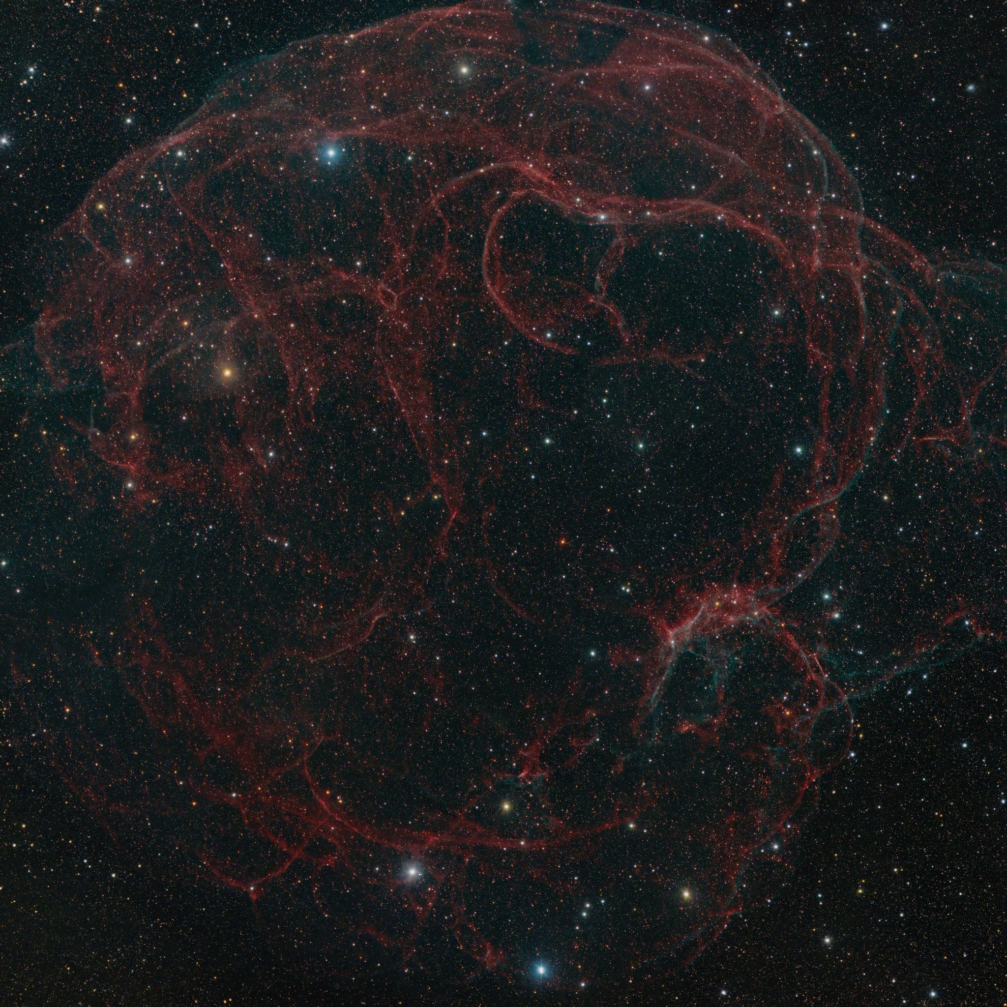 Description: This SNR is a quite large one and requires the complete field of the reduced 100 ED. South is up (PW=-174°), scale is 1,86 arc sec / pix. Although I don’t really like processing stars and nebulae separately, I did it that way here. To top it all off, I also slightly reduced the size of the stars, because the sheer number of stars would otherwise require a brightening of the nebula, which would look unrealistic. I wanted to preserve the dark-ish character of the nebula. The [OII] component should only appear as a very faint veil, since it is also very weak in reality.