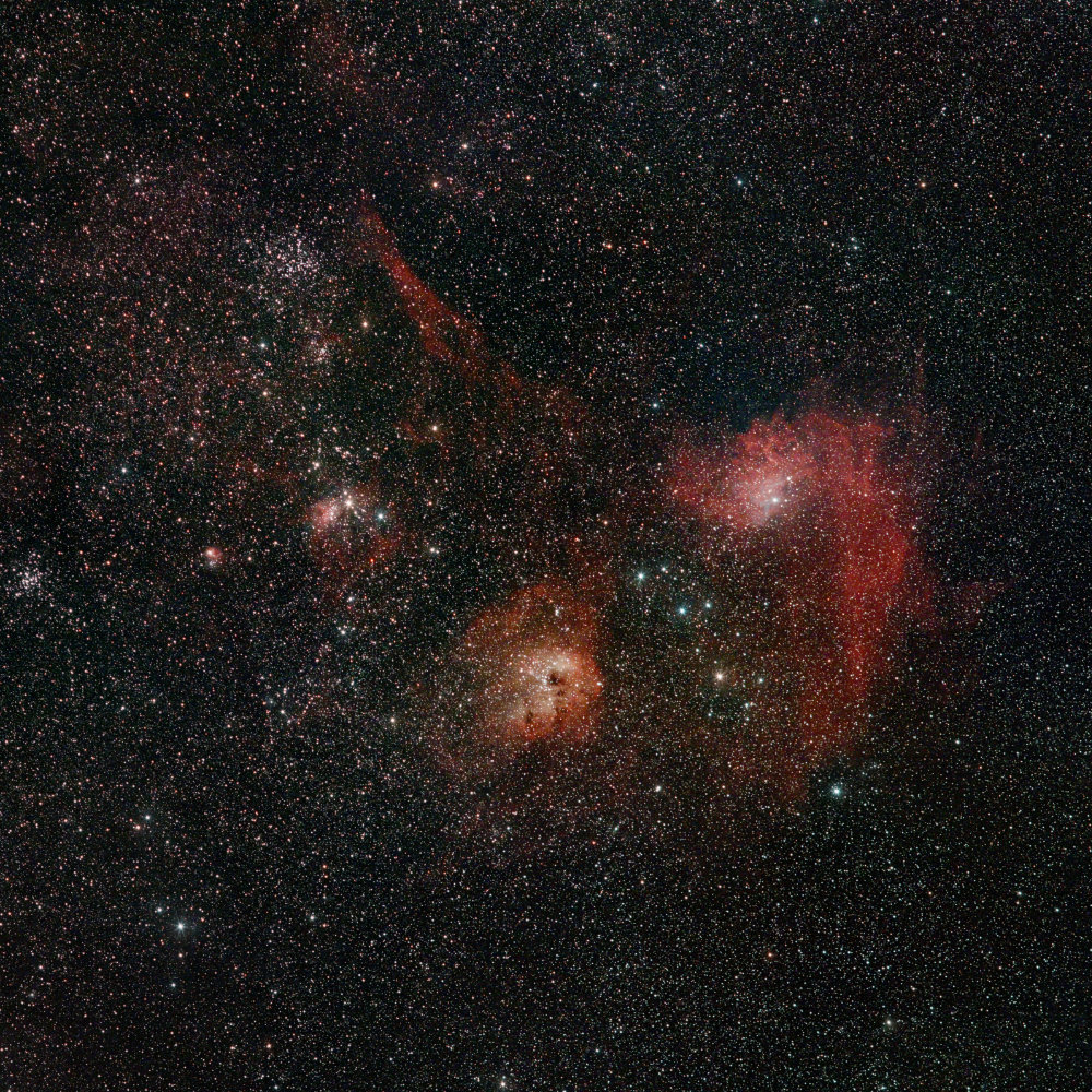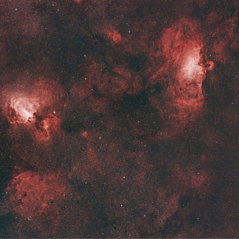 Description: Using this unusual PA of 63°, both nebulas fit in the FOV, scale is 1.86 arc sec / pix. Chip distance: 77,70 mm. Compare with my shot of the Eagle Nebula from 2012 at this page that shows several photos of this region.