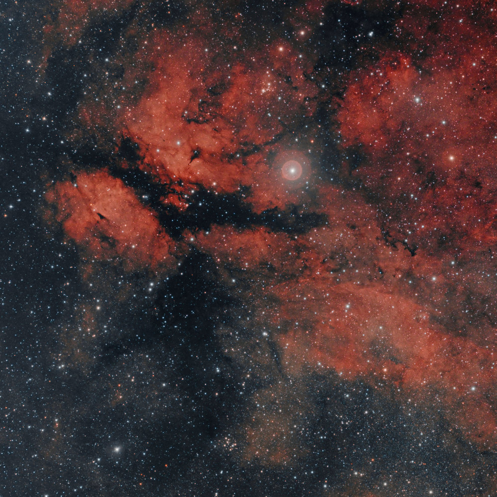 Description: This famous region within Cygnus shows diffuse emission nebulas surrounding Sadr or Gamma Cygni and the crescent nebula at the lower right.The open cluster at the lower left ist M29. North is up, scale is 1.86 arc sec / pix. Chip distance: 77,85.mm.