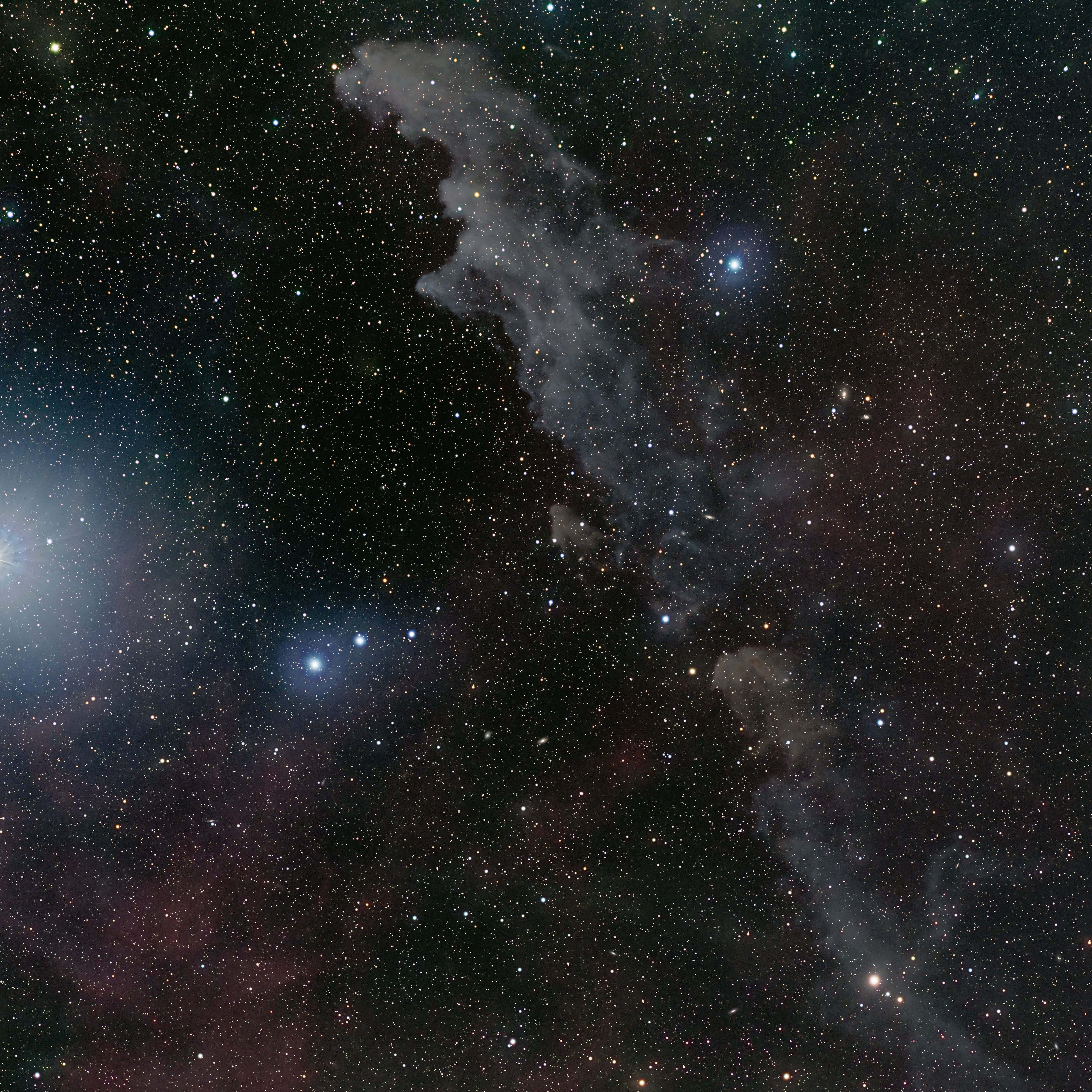 Description: Not the famous Horsehead of Orion, but rather a fainter nebula in Scorpius. The main part is a molecular cloud complex and cataloged as IC4592. The bright star at the right is Mars. Near the middle at the top of the photo located is M80. I put south up in order to have a better visual impression.