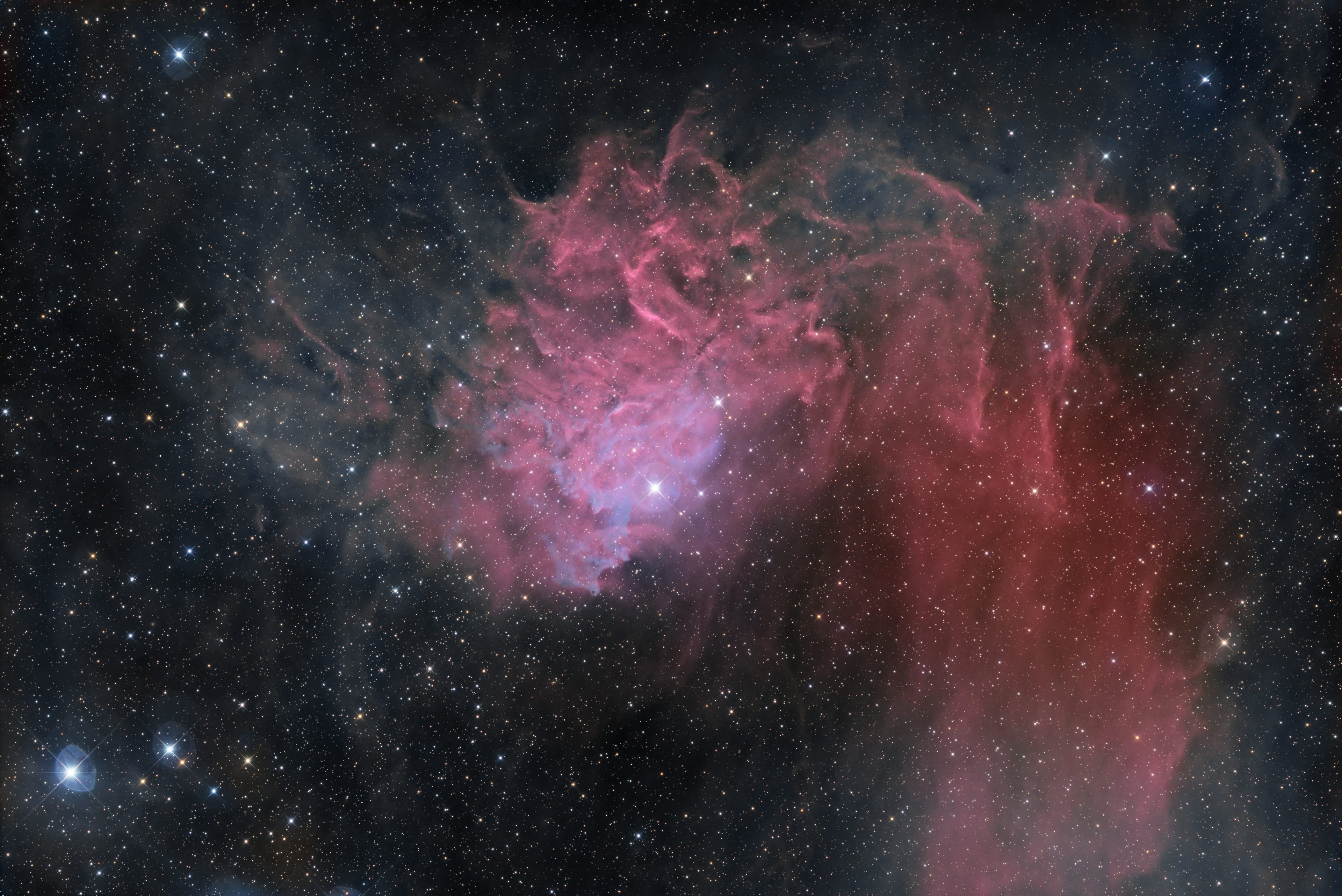 | Processing | APT Tools. PI: Preprocessing,Farbkalibierung, MLT-entrauscht, Sterne etwas verkleinert,Nebel gepushed nach Wechselberger PS: Anpassen Gradation, weiter entrauscht, Reste vom Gradienten mittels slektiver Auswahl markiert und dann über Tonwertkorrektur und Sättigung entfernt. |