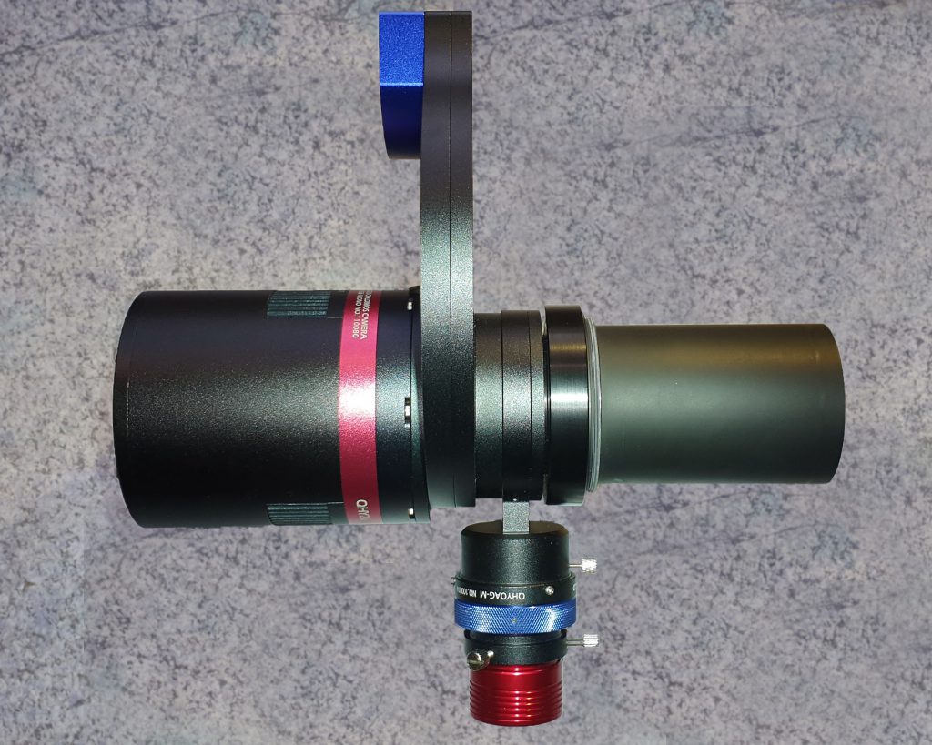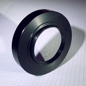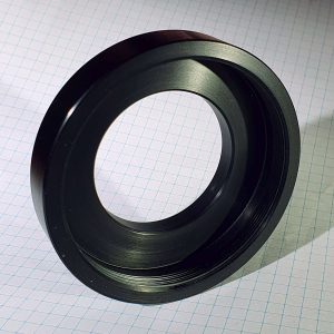 Die Adaption ist recht einfach, da der Korrektor über reichlich Arbeitsabstand verfügt. Im Wesentlichen geht es um die Umsetzung des M68x1 Anschlusses an ein zur Kamera passendes Gewinde. Die Bilder zeigen den bereits fertig eloxierten Adapter von beiden Seiten. Die Zeichnung zeigt das Design genauer und kann ggf. zum Nachbau dienen.