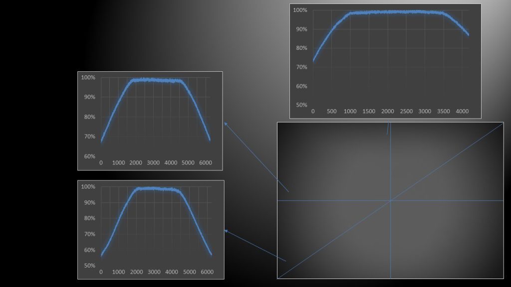 Das Masterflat zeigt eine gute aber zu den Ecken hin deutlich abfallende Ausleuchtung. Ohne den Konturplot wären keine Asymmetrien in der Ausleuchtung zu erkennen, die Justage des Fangspiegel hinsichtlich Offset scheint nahezu perfekt zu sein. Eine genaue Analyse ist in der nachfolgend dargestellten Grafik zusammengestellt. Bei dem vertikalem Schnitt erkennt man dann doch eine Asymmetrie, vermutlich ist eine leichte Abschattung durch das Prisma des Off-Axis-Guiders die Ursache hierfür. In den Ecken kann man einen Abfall der Ausleuchtung auf bis unter 60% feststellen. Das bedeutet immerhin einen Verlust von einer halben Größenklasse. Das kann man zwar per Flat korrigieren, aber aufmerksame Betrachter können das unter Umständen bei bestimmten Motiven erkennen.