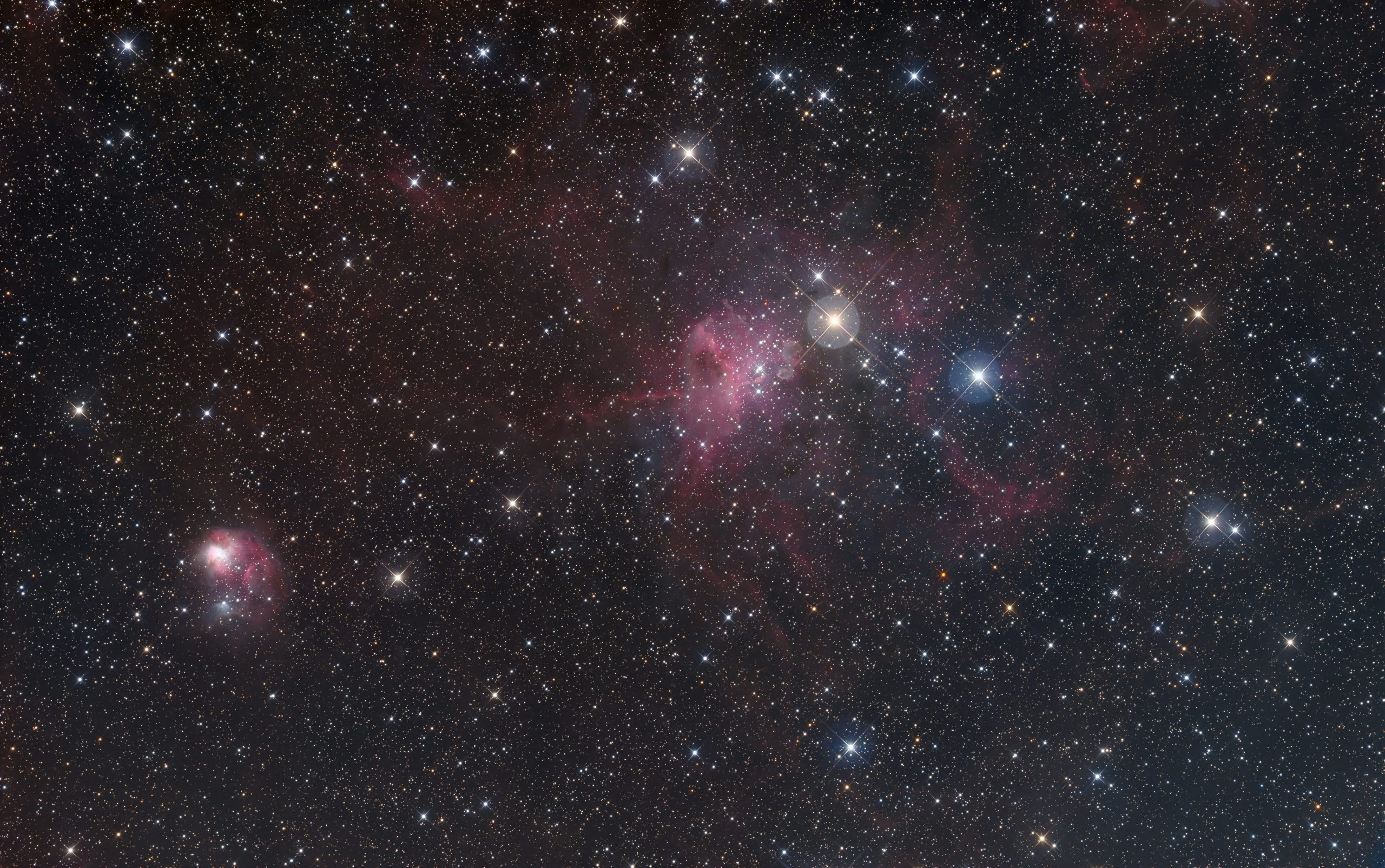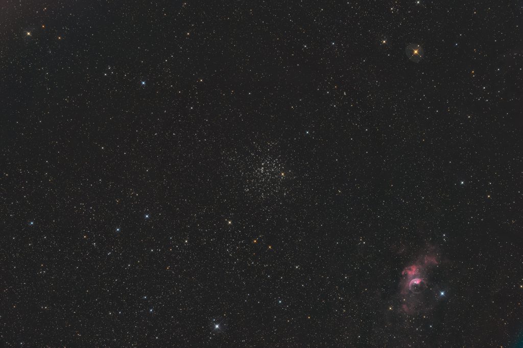 Die Bearbeitung erfolgte ohne besondere Maßnahmen, es wurde eine künstliche Luminanz aus L+R+G+B verwendet, um die zu knappe Luminanzbelichtugszeit zu kompensieren. Noch im linearen Bereich wurde BlurXTerminator angewendet. Damit sind die Unzulänglichkeiten in der Abbildung in den Ecken nahezu vollständig verschwunden. Es fallen noch die Halos um die helleren Sterne auf. Möglicherweise stehen diese im Zusammenhang mit den leicht gelblich erscheinenden Linsen des Starizona Nexus.