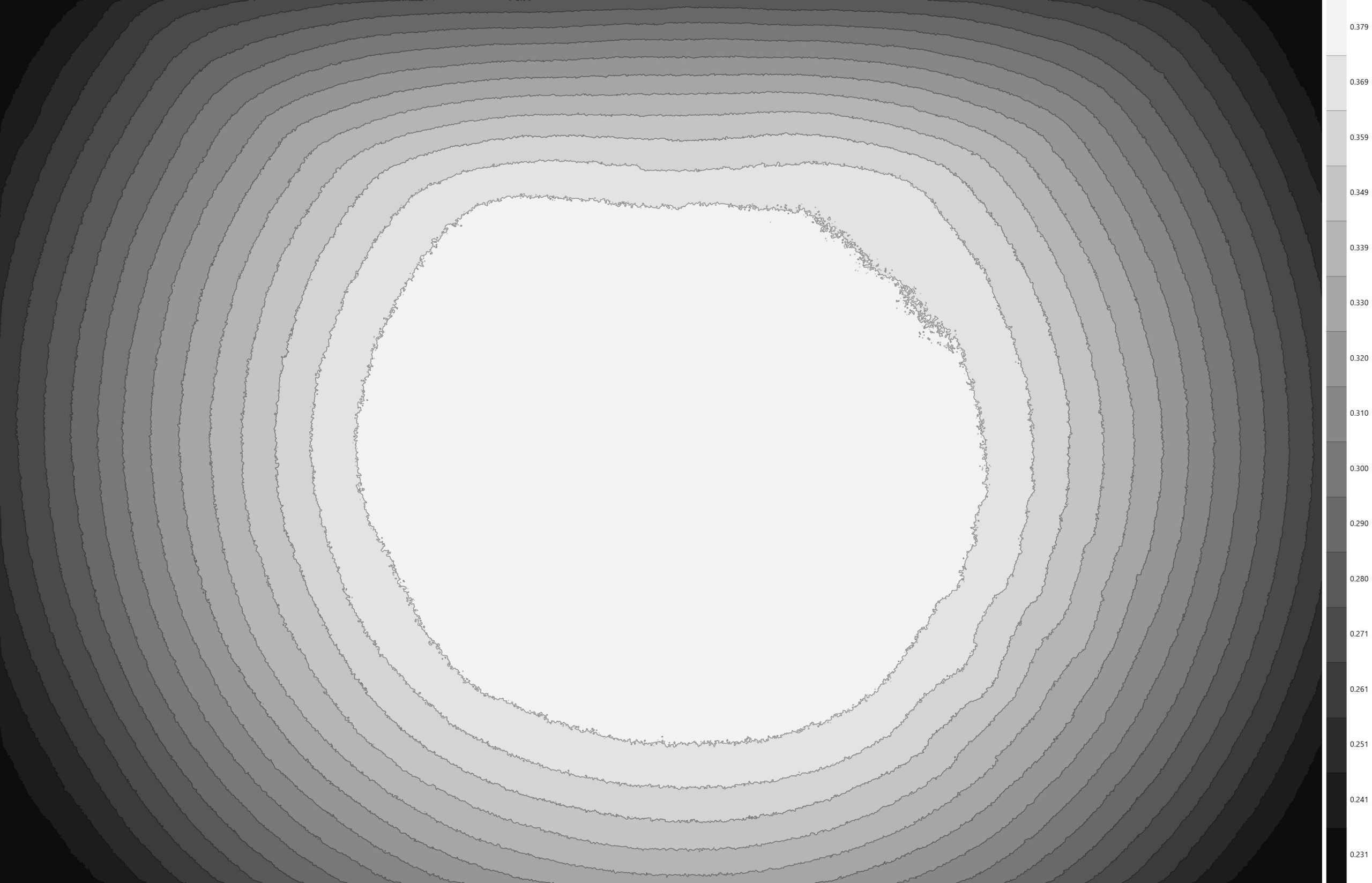Das Masterflat zeigt eine gute aber zu den Ecken hin deutlich abfallende Ausleuchtung. Ohne den Konturplot wären keine Asymmetrien in der Ausleuchtung zu erkennen, die Justage des Fangspiegel hinsichtlich Offset scheint nahezu perfekt zu sein. Eine genaue Analyse ist in der nachfolgend dargestellten Grafik zusammengestellt. Bei dem vertikalem Schnitt erkennt man dann doch eine Asymmetrie, vermutlich ist eine leichte Abschattung durch das Prisma des Off-Axis-Guiders die Ursache hierfür. In den Ecken kann man einen Abfall der Ausleuchtung auf bis unter 60% feststellen. Das bedeutet immerhin einen Verlust von einer halben Größenklasse. Das kann man zwar per Flat korrigieren, aber aufmerksame Betrachter können das unter Umständen bei bestimmten Motiven erkennen.