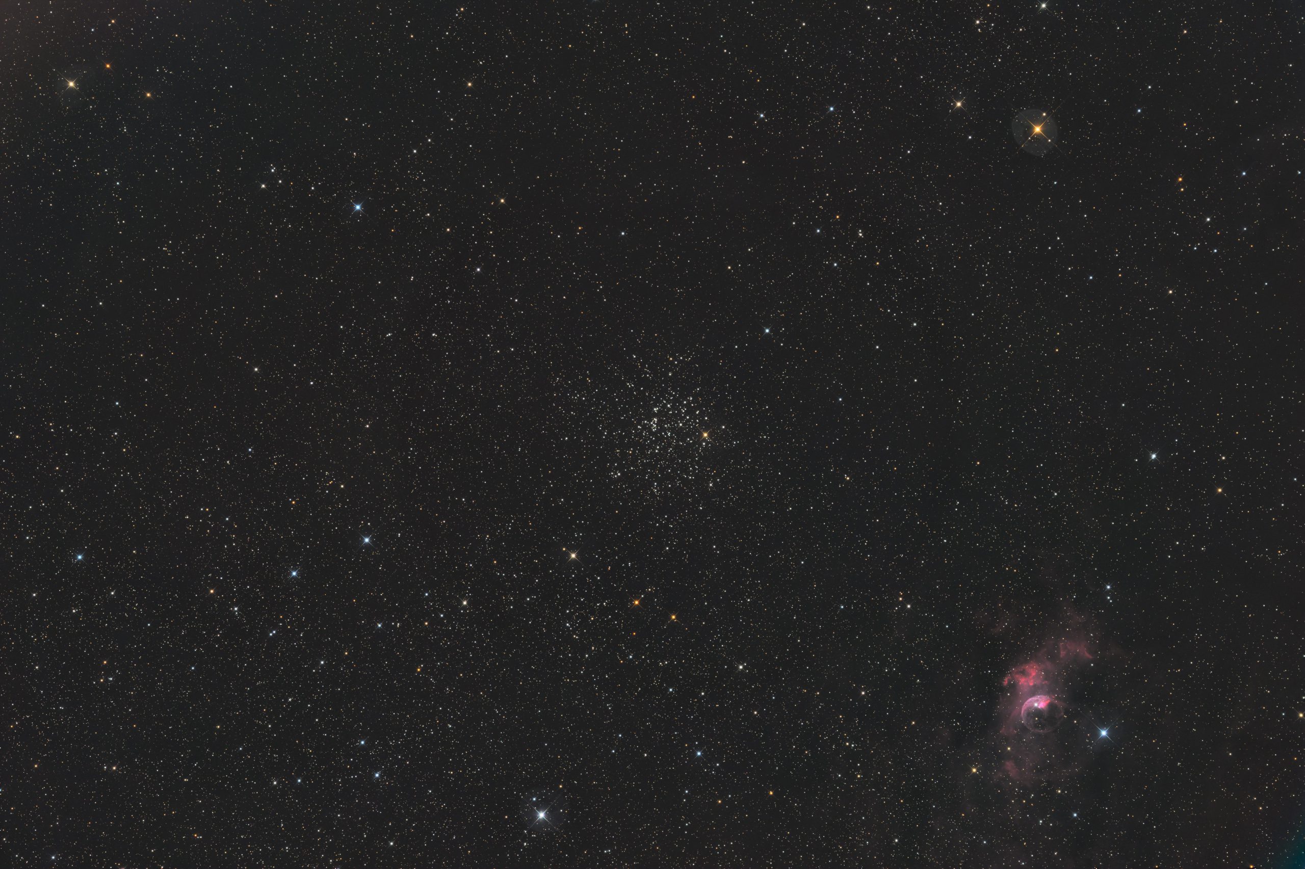 Die Bearbeitung erfolgte ohne besondere Maßnahmen. Durch den Einsatz von BlurXTerminator ist die Unzulänglichkeit in der Abbildung in der Ecke vollständig verschwunden. Diesmal fallen die Halos um die helleren Sterne nicht besonders auf. Die Aufnahme wurde bei schlechten Bedingungen (durchziehende Wolken, Mond k=0,88) angefertigt. Die dadurch entstehenden Gradienten konnte ich in den Ecken nicht ohne größeren Aufwand restlos entfernen.