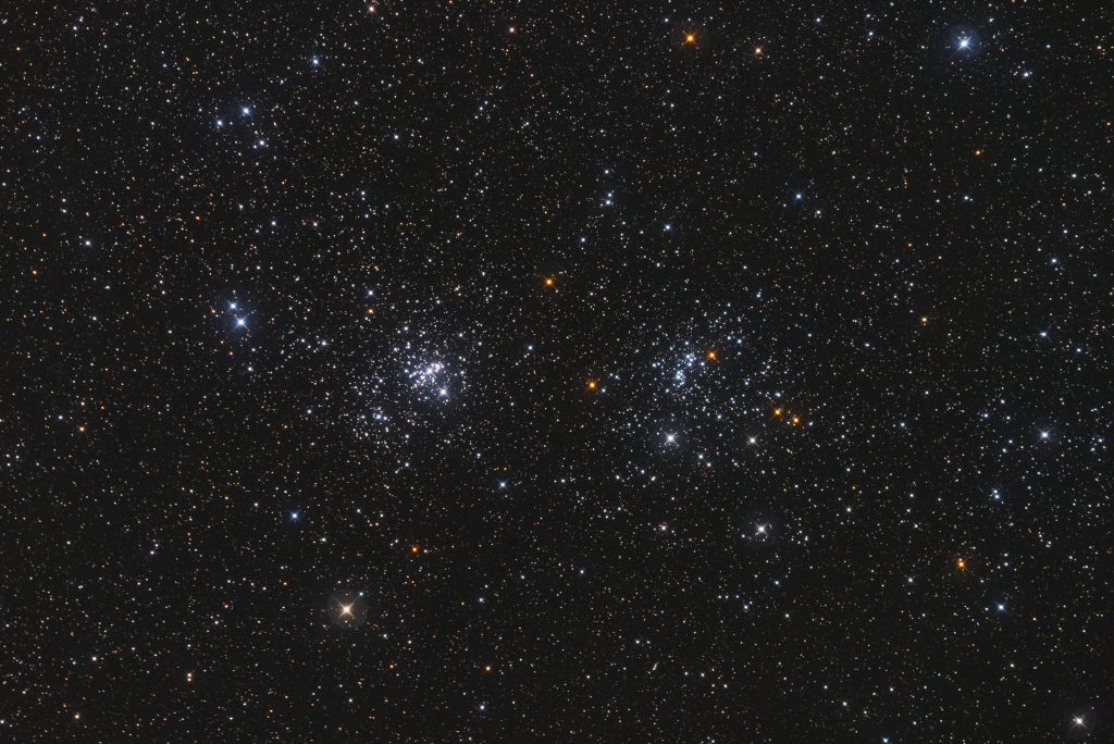 Das Testbild zeig h+chi im Perseus. Aufgenommen am Abend des 12.11.2023 zwischen 23:25 und 00:25. LRGB mit 10“ Newton und TSKorrr2 bei 720mm Brennweite. 18/6/6/6 x 2 min, gesamte Belichtungszeit 72 min. Readout Mode #4 (Photographic Mode-2CMS), Gain: 26, Offset: 20, Chiptemperatur -20°C.