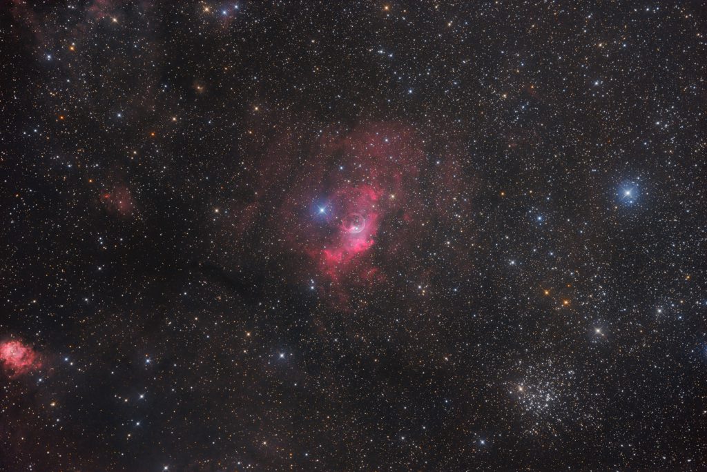 Das Testbild zeigt den Bubblenebel mit seiner Umgebung. Aufgenommen am Abend des 03.11.2023 zwischen 20:22 und 23:20. LRGB mit 10“ Newton und TSKorrr2 bei 720mm Brennweite. 30/10/10/10 x 2 min, gesamte Belichtungszeit 2h. Readout Mode #4 (Photographic Mode-2CMS), Gain: 26, Offset: 20, Chiptemperatur -10°C, Mond: k=0.7, Aufgang 20:36.