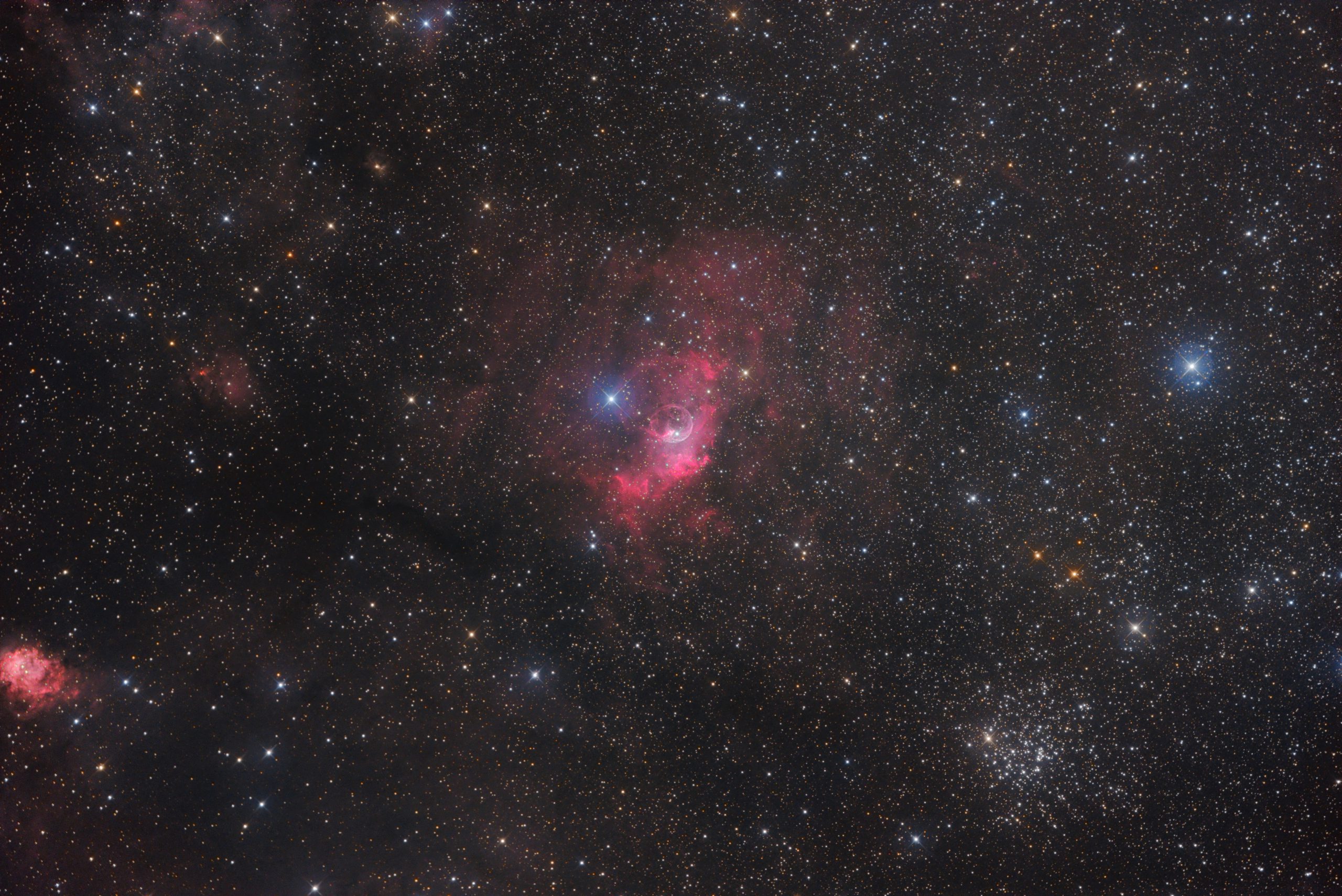 Das Testbild zeigt den Bubblenebel mit seiner Umgebung. Aufgenommen am Abend des 03.11.2023 zwischen 20:22 und 23:20. LRGB mit 10“ Newton und TSKorrr2 bei 720mm Brennweite. 30/10/10/10 x 2 min, gesamte Belichtungszeit 2h. Readout Mode #4 (Photographic Mode-2CMS), Gain: 26, Offset: 20, Chiptemperatur -10°C, Mond: k=0.7, Aufgang 20:36.