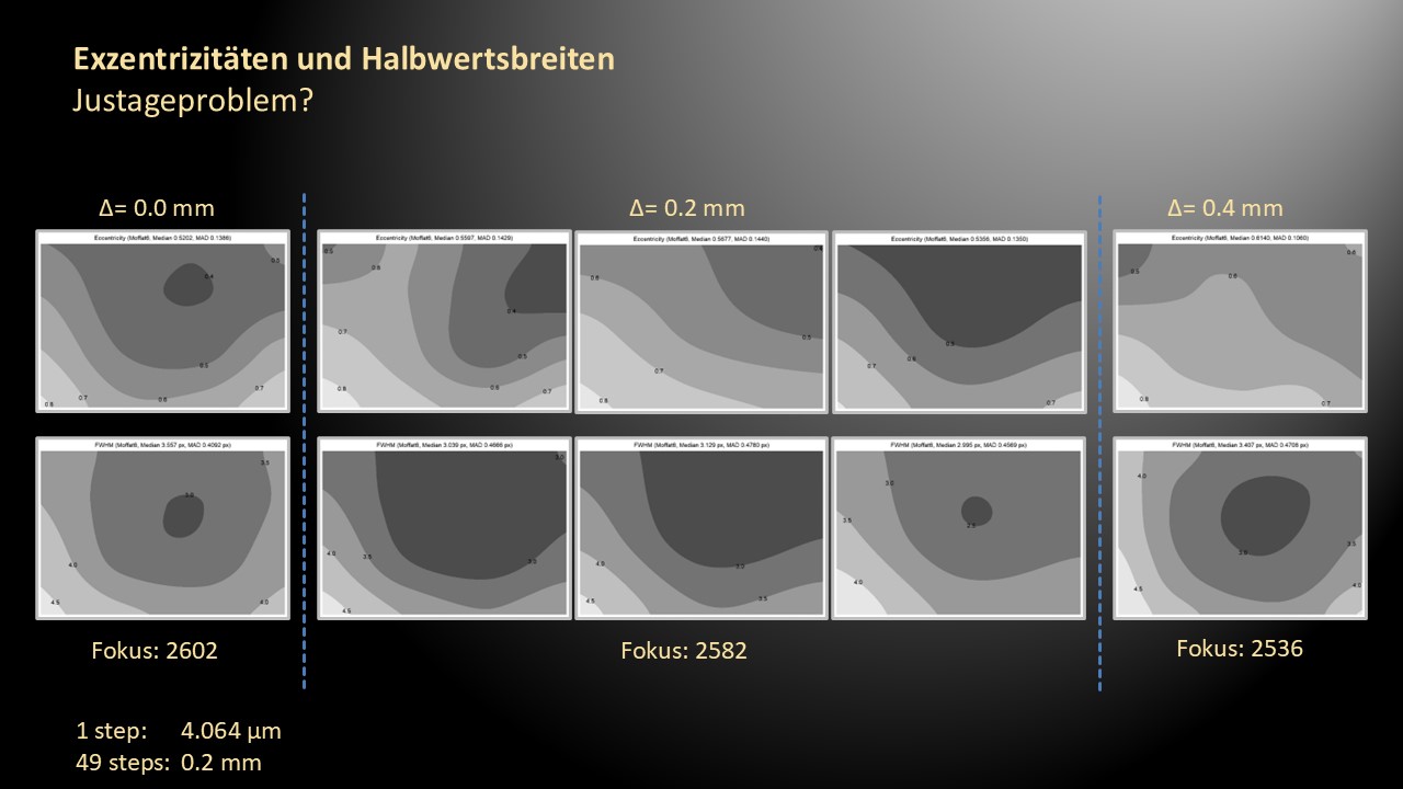 - Der hier beobachtete Effekt kann durch den Justagefehler verursacht werden. Die Bilder zeigen, dass der „sweet spot“ immer zu weit oben rechts liegt.