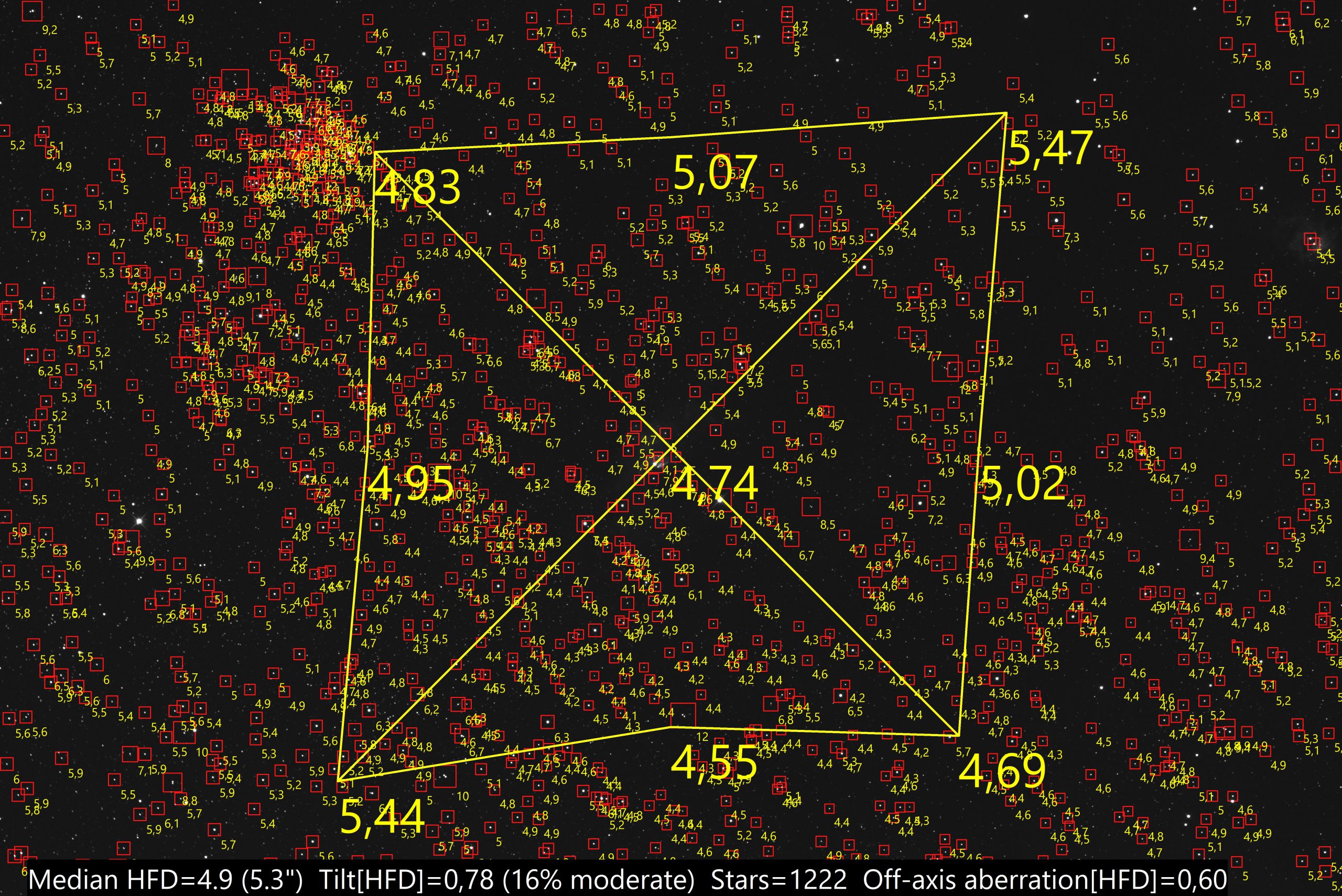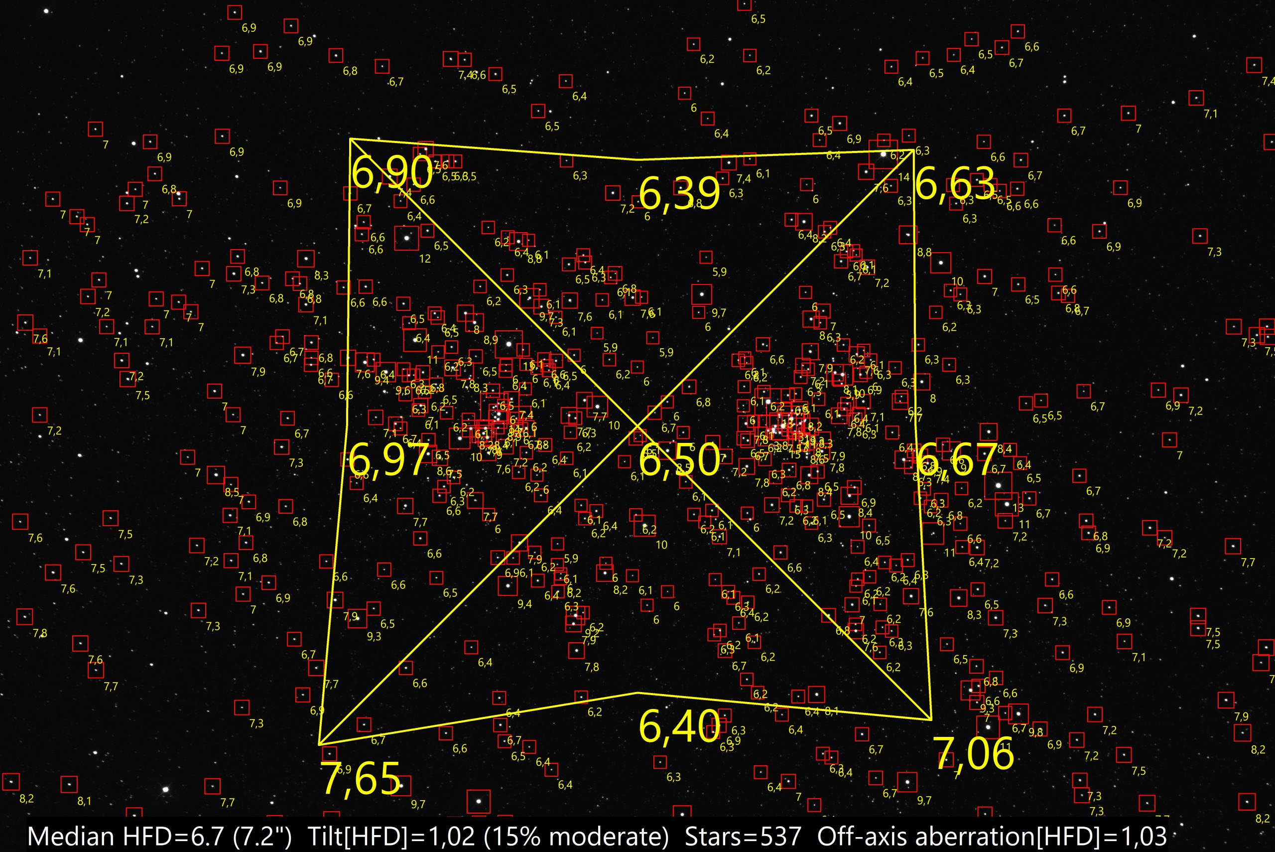 Die Abbildungsqualität in den Ecken ist zwar deutlich besser als beim letzten Test, aber immer noch zu schlecht, um das ganze Bildfeld zu nutzen. ASTAP zeigt bei allen Frames eine mehr oder weniger starke Verkippung an.
