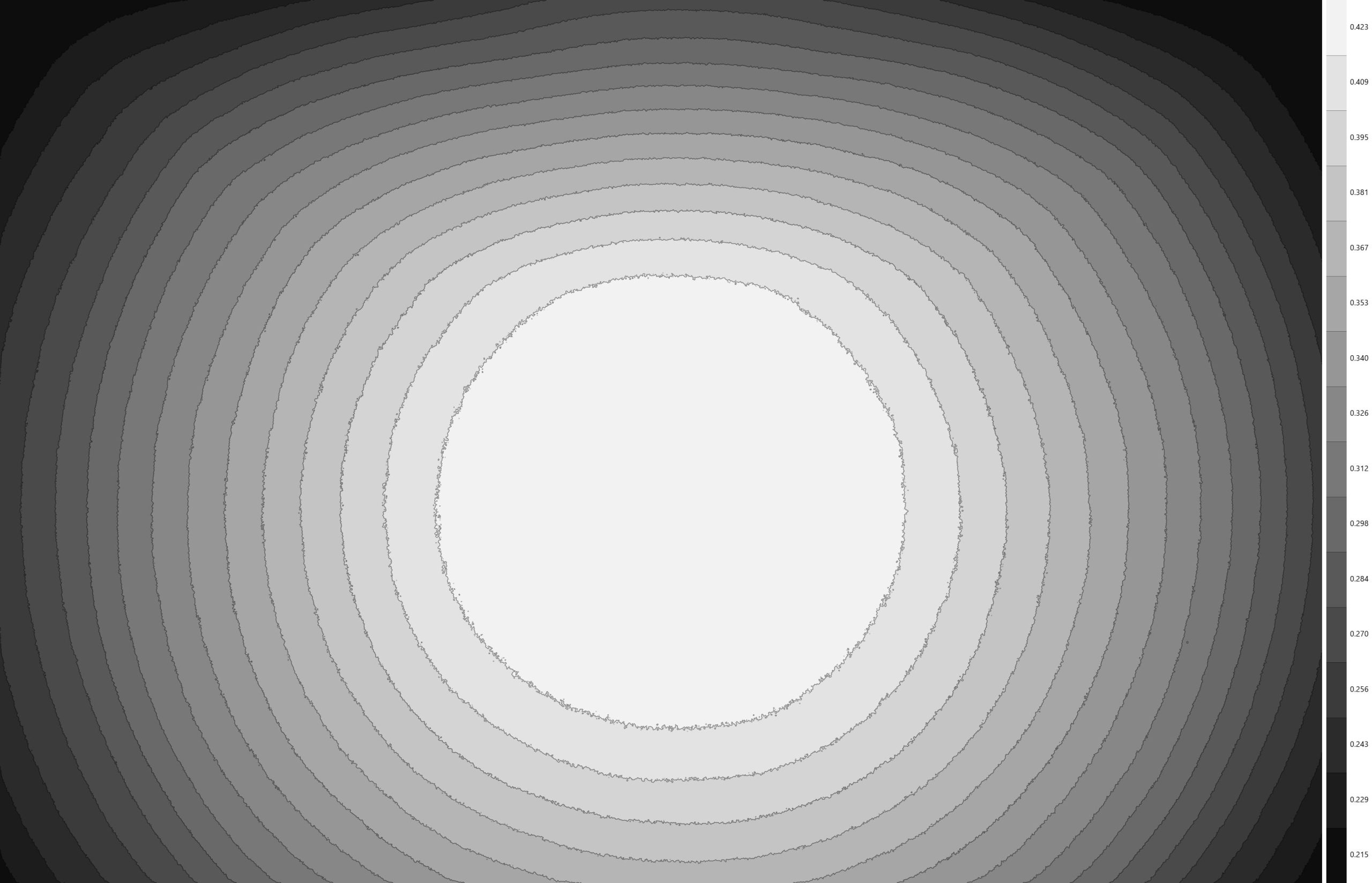 Die Ausleuchtung ist wie erwartet grenzwertig, aber verwendbar. In den äußersten Ecken ergibt sich eine Ausleuchtung von 50%. Das ist aber sowieso außerhalb des definierten Bereiches des TSKorrr2. Die Abbildung zeigt ein einzelnes Flat. Der Kreis markiert einen Durchmesser von 22 mm (5852 Pixel). Zitat aus der TS-Seite: „Nutzbares Bildfeld bis 30 mm (APS-C-Format) mit Flat/ voll korrigiert und ausgeleuchtet bis 22 mm“.