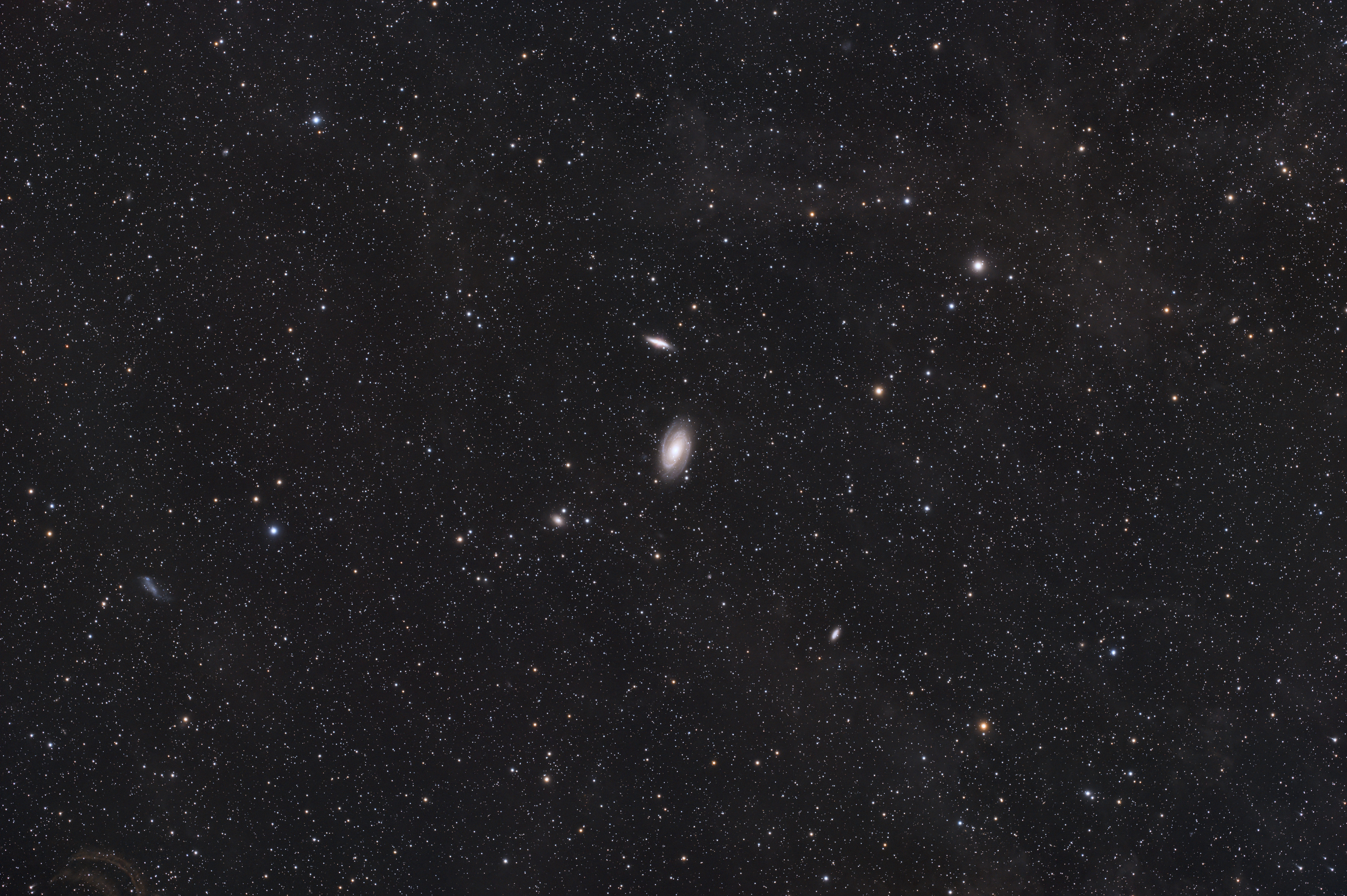 The Pleiades 68 will stay in my tool box. It fulfils my expectations and performs quite good in combination with a full frame sensor. It offers a good balance between imaging performance and portability. The test shot in this section of M 81 and M 81 with their vincinity demonstrates the full potential of this set-up. Since I was interested what more powerful processing tools would reveal, I added a higher processed version of it here, as well. Again the files behind the picture links are unscaled, i.e., in the original scale of the system.
